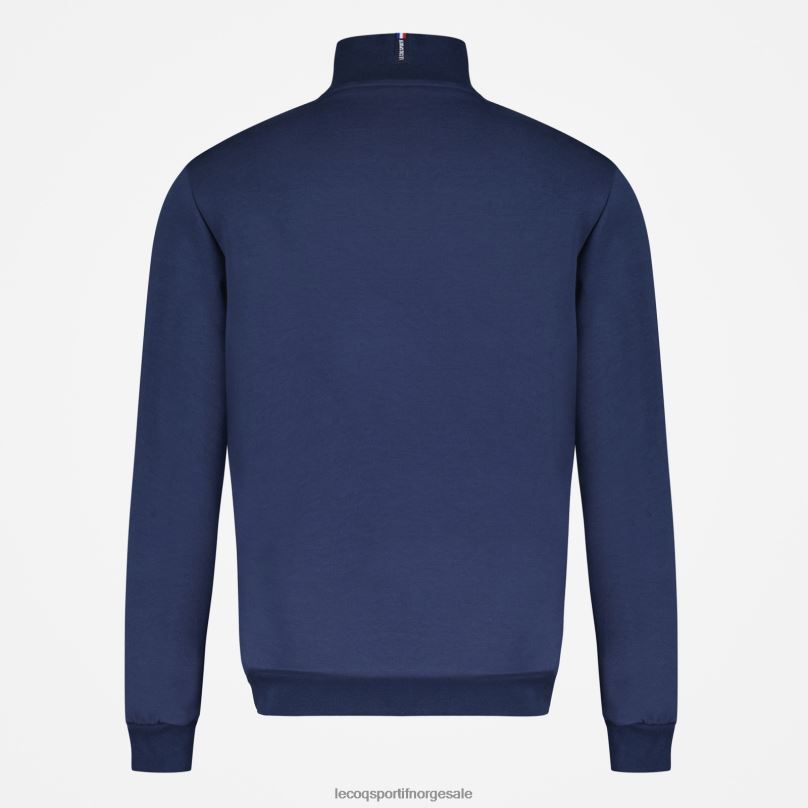 – ståkrage med halv glidelås foran, blå/hvit/rød etikett med “le coq sportif”-tekst midt bak krage